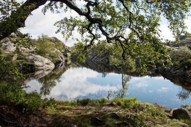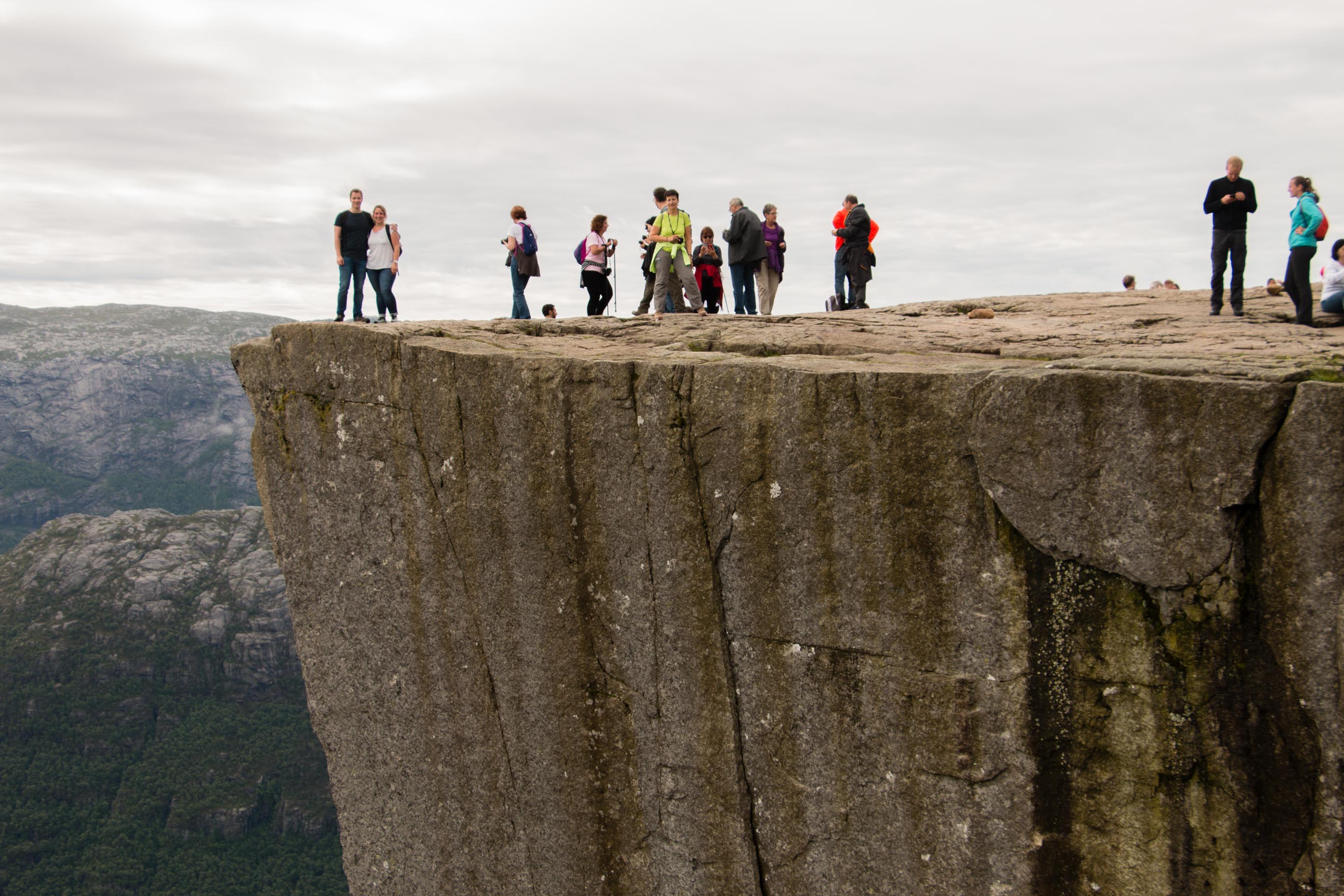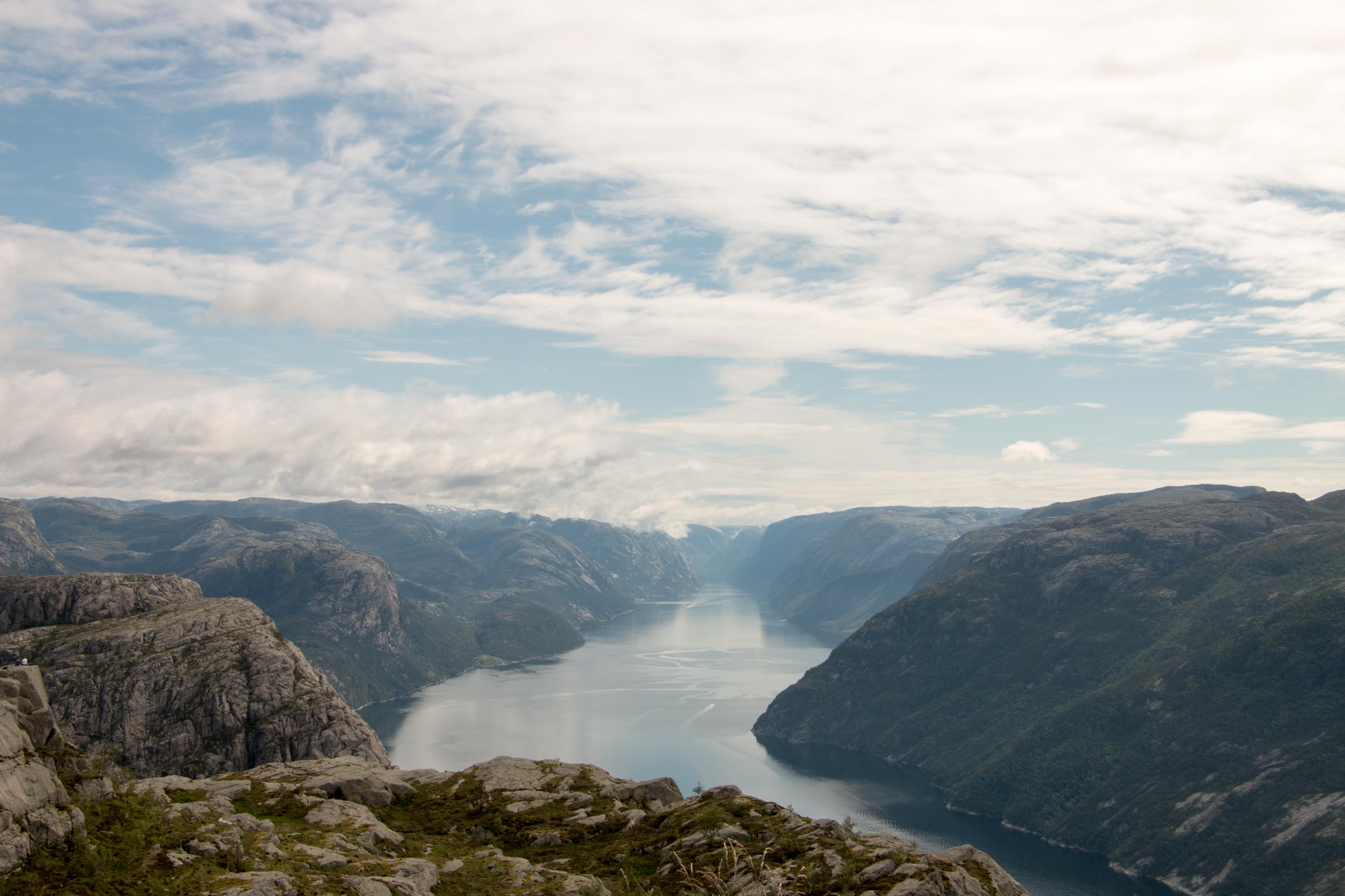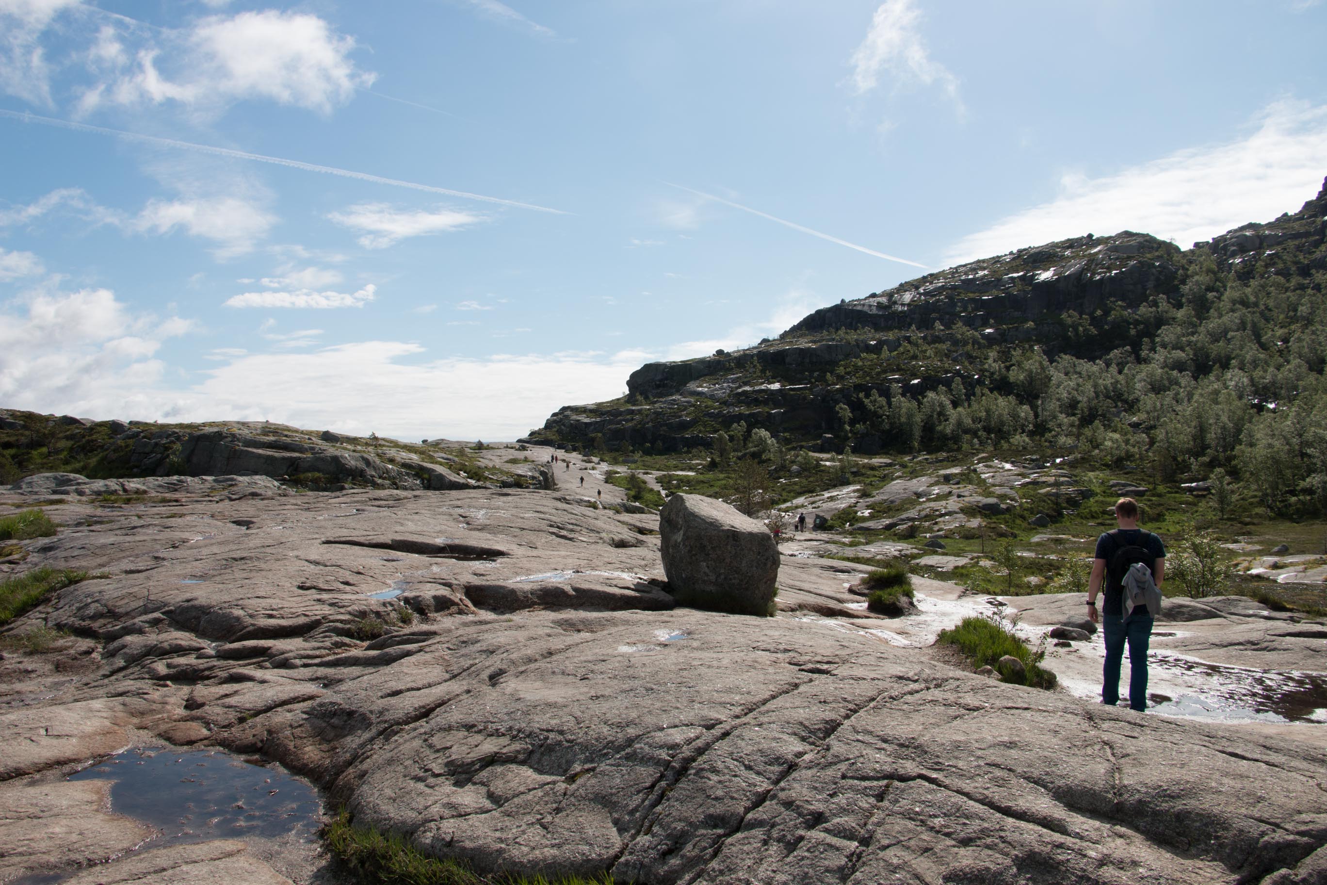 We volgen netjes onze navigatie en voor we het weten staan we in de rij om een veerpont op te rijden. Tja, in Noorwegen ontkom je hier niet aan alleen zijn we net 5 minuten geleden van de andere boot afgereden en is het even wennen om jezelf op deze manier te verplaatsen. Door de veerpont te nemen komen we vroeg aan bij de parkeerplaats van de preikenstolen. Het is 08.45u als we aan de wandeling beginnen. Het is een pittige wandeling die ons behoorlijk laat klimmen. De omgeving wisselt zich af met bebossing, steile rostpatijen en prachtige vergezichten. Het zal ongeveer zo’n 2 uur duren voordat we de preikestolen bereiken. Eenmaal aan de top is het uitzicht echt fantastisch en hebben we dit mooi even geflikt op onze eerste vakantiedag! Helaas heeft Stijn behoorlijk wat te voorduren gehad onderweg en is hij letterlijke en figuurlijk lek geprikt door de muggen.