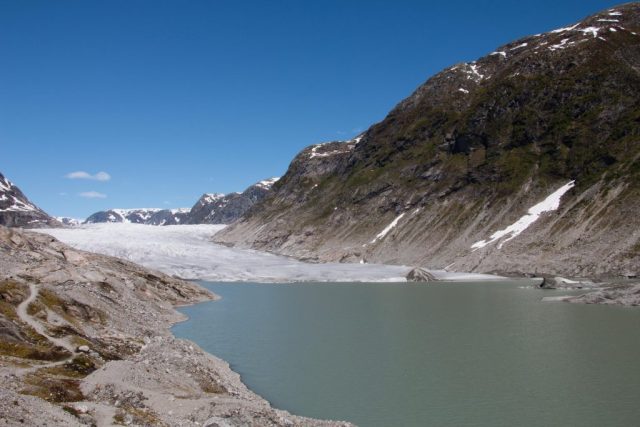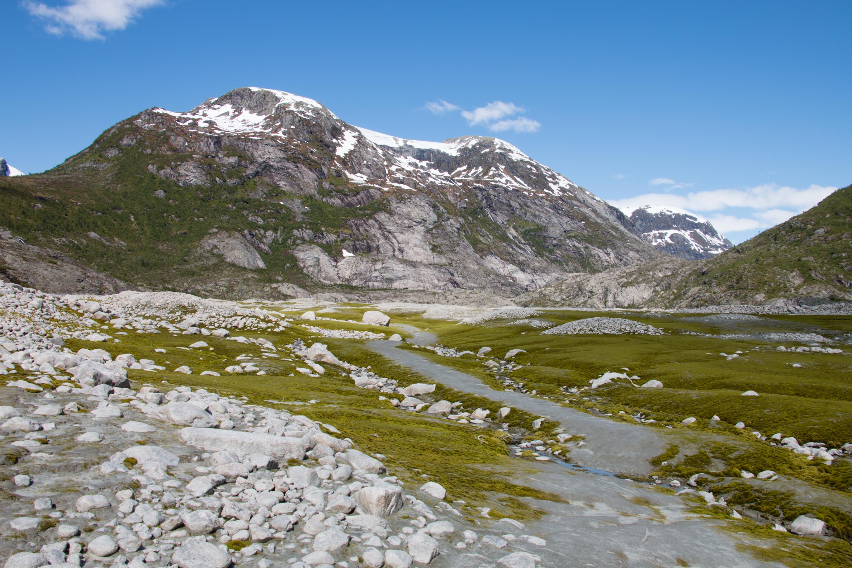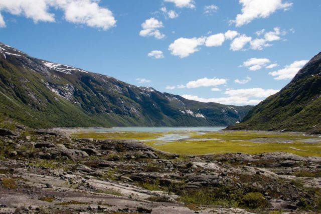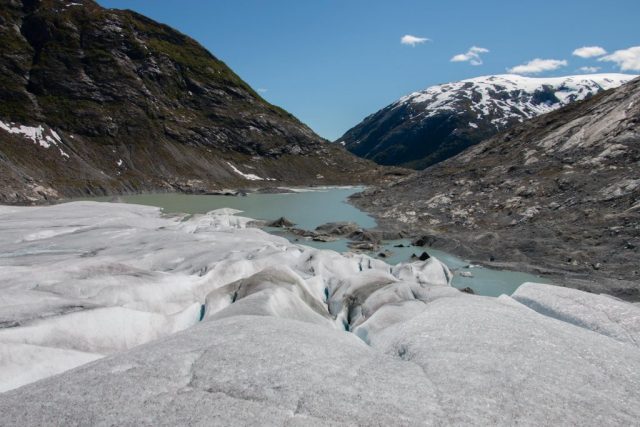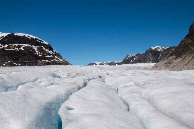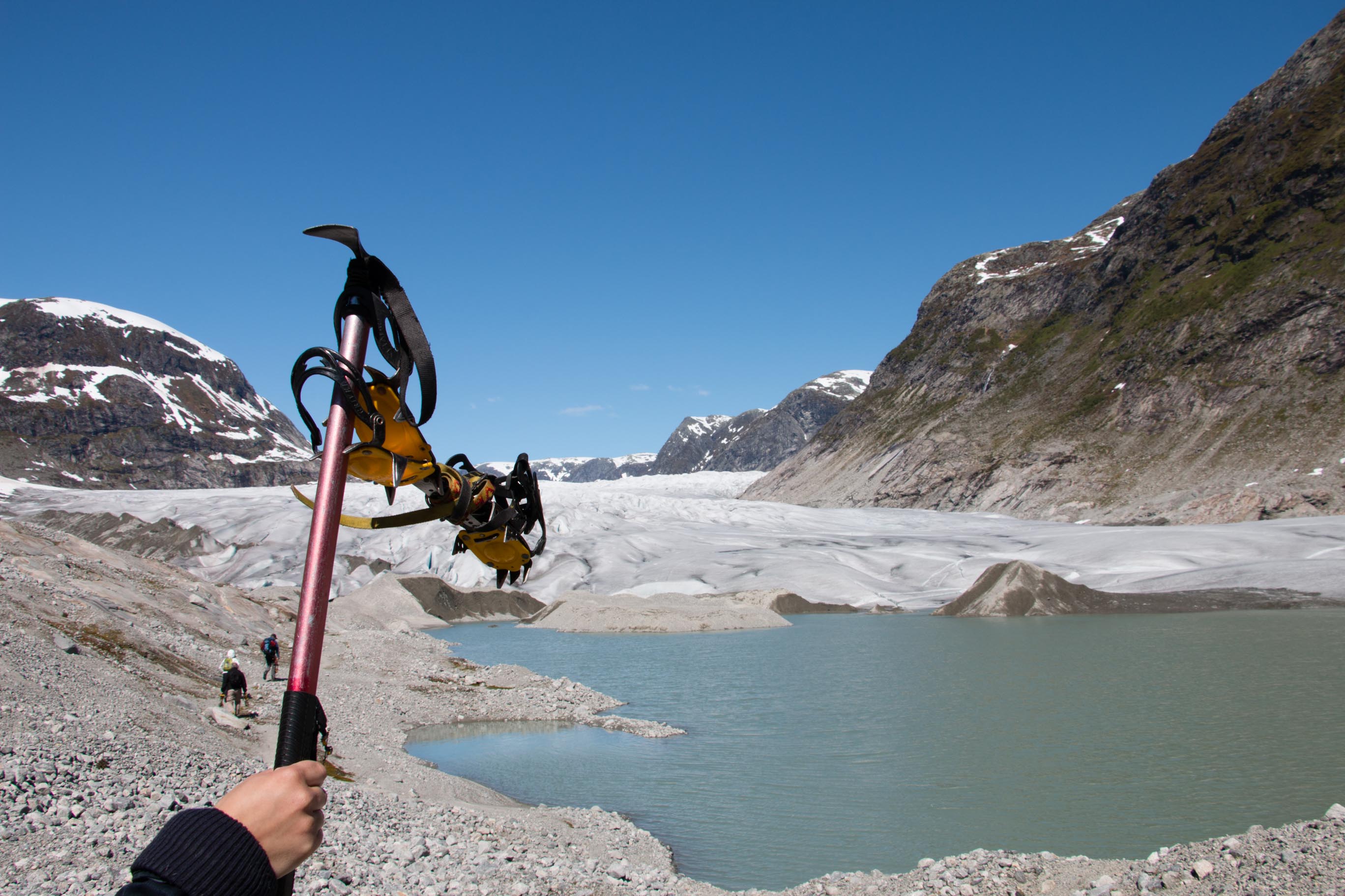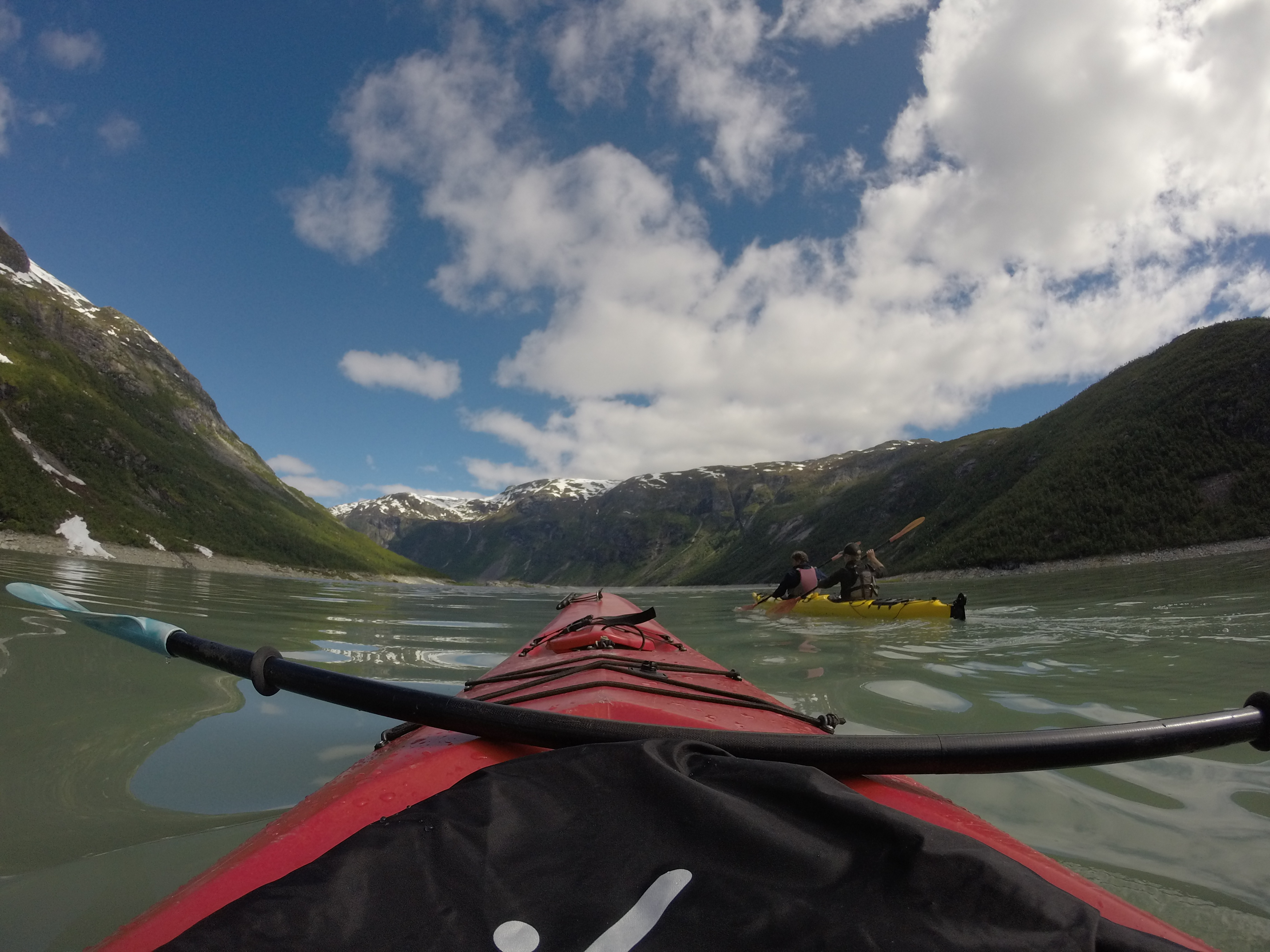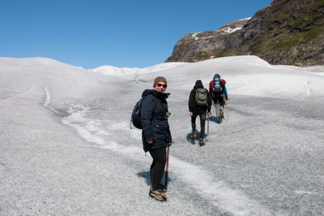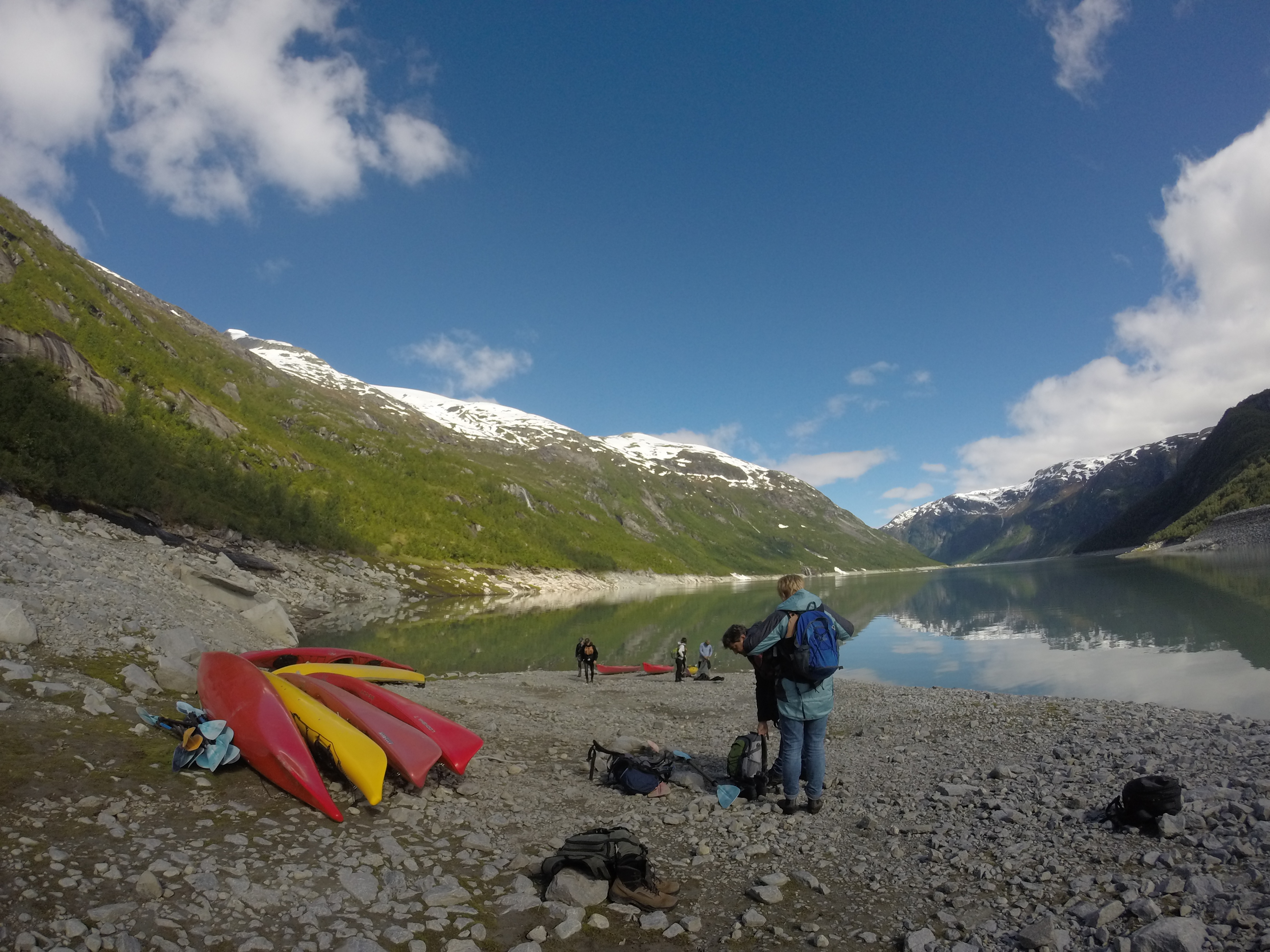We vertrekken vanmorgen al vroeg voor dé hike van de vakantie. Een wandeling naar en over de gletsjers Tunsbergsbreen. Het is een hike van, ruim een uur kayaken, anderhalf uur wandelen en dan als kers op de taart… De gletsjer! Na een geweldige tocht ernaar toe met bijzonder mooie en afwisselende natuur maken we een super gave wandeling op de gletsjer. Voordat we de gletsjer opgaan krijgen we eerst spikes onder de schoenen en krijgen we duidelijke instructies van de gids van wat we wel of niet mogen doen. Eenmaal gereed, bepakt en bezakt trotseren we de gletsjer! Het is een geweldige ervaring. Het is een immens grote witte vlakte met op sommige stukken diepe kloven die prachtig blauw van kleur zijn. Als op sommige plekken een stukje ijs de koof in brokkelt hoor je hoe dik de gletsjer is en hoe lang het stukje ijs erover doet om neer te komen. Het is hier zo mooi en rustgevend dat je eigenlijk nooit meer weg zou willen! Vol bewondering en na misschien een klein beetje adrenaline keren we weer terug naar de kayaks. Het is een vermoeiende maar ook onbeschrijfelijke ervaring geweest, zo kicken en onwijs gaaf om daar geweest te zijn helemaal ‘alleen’, in the middle of nowhere.