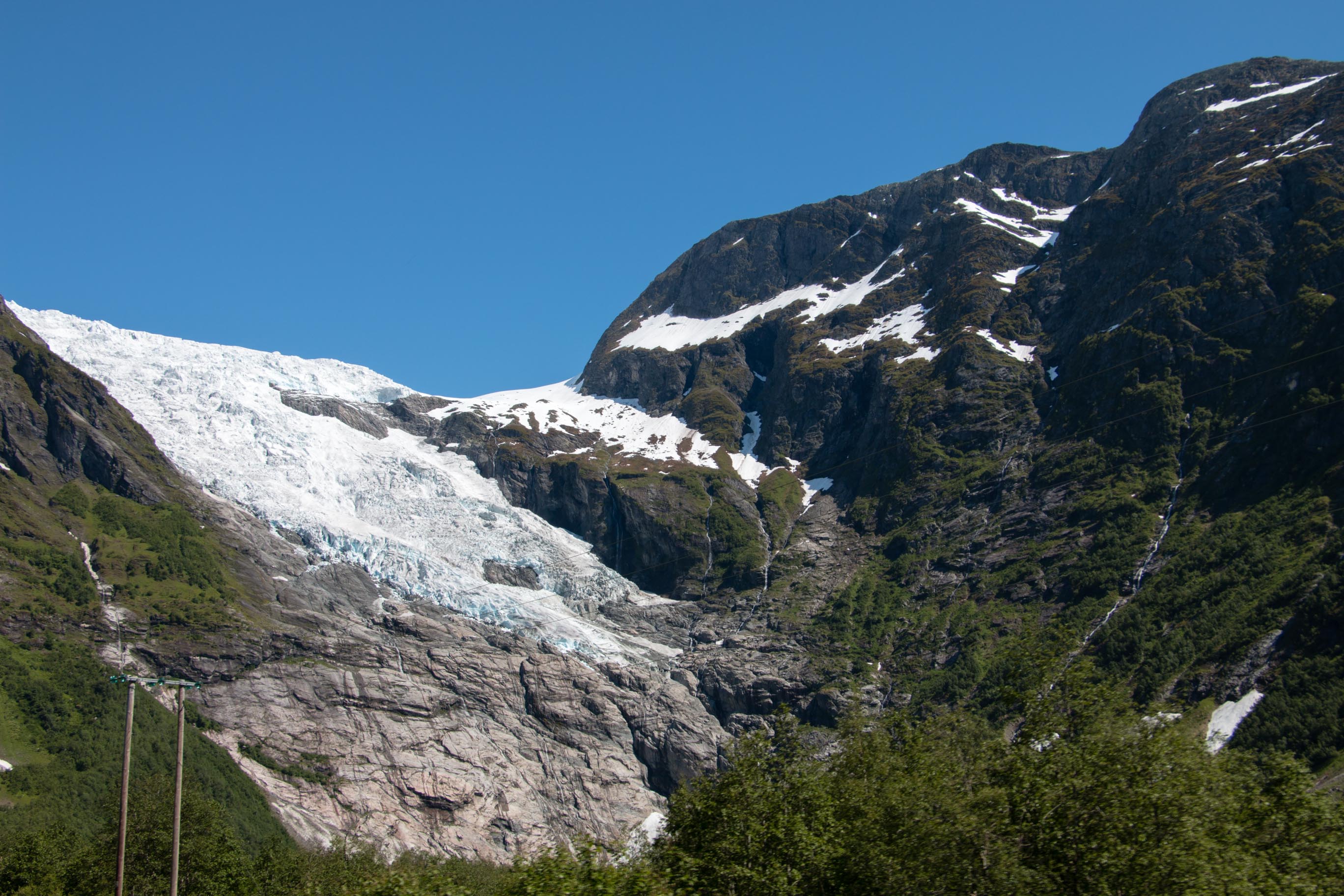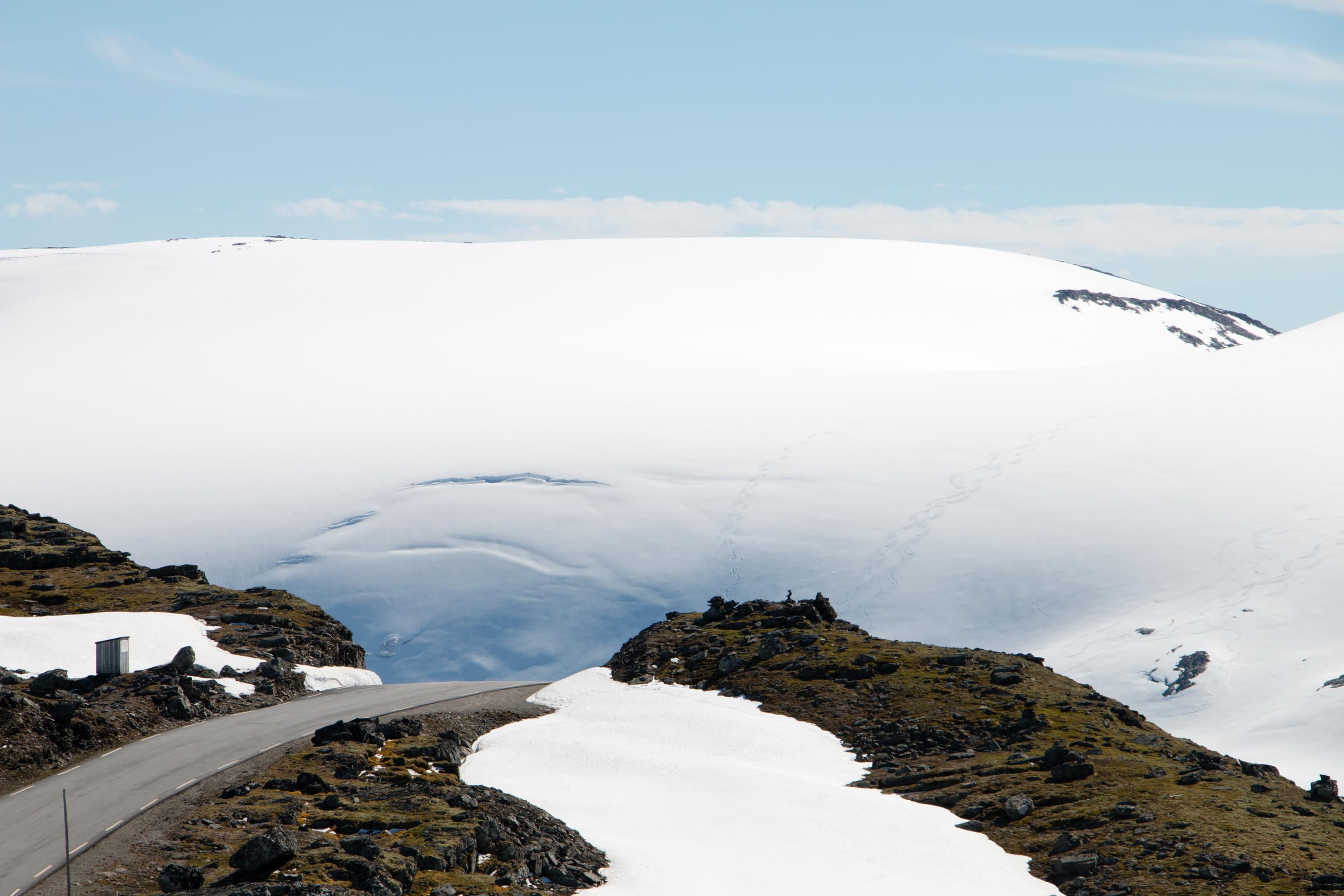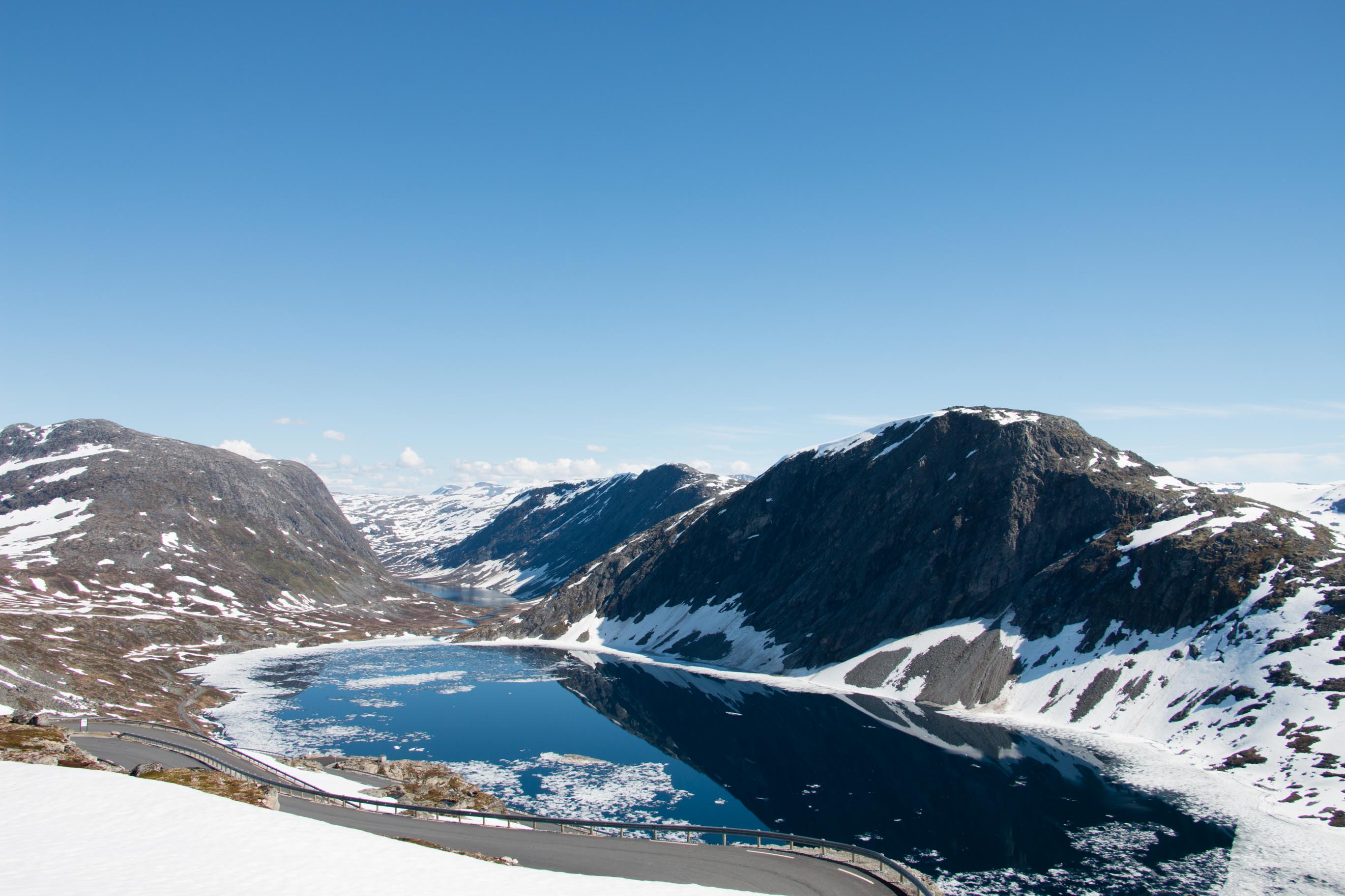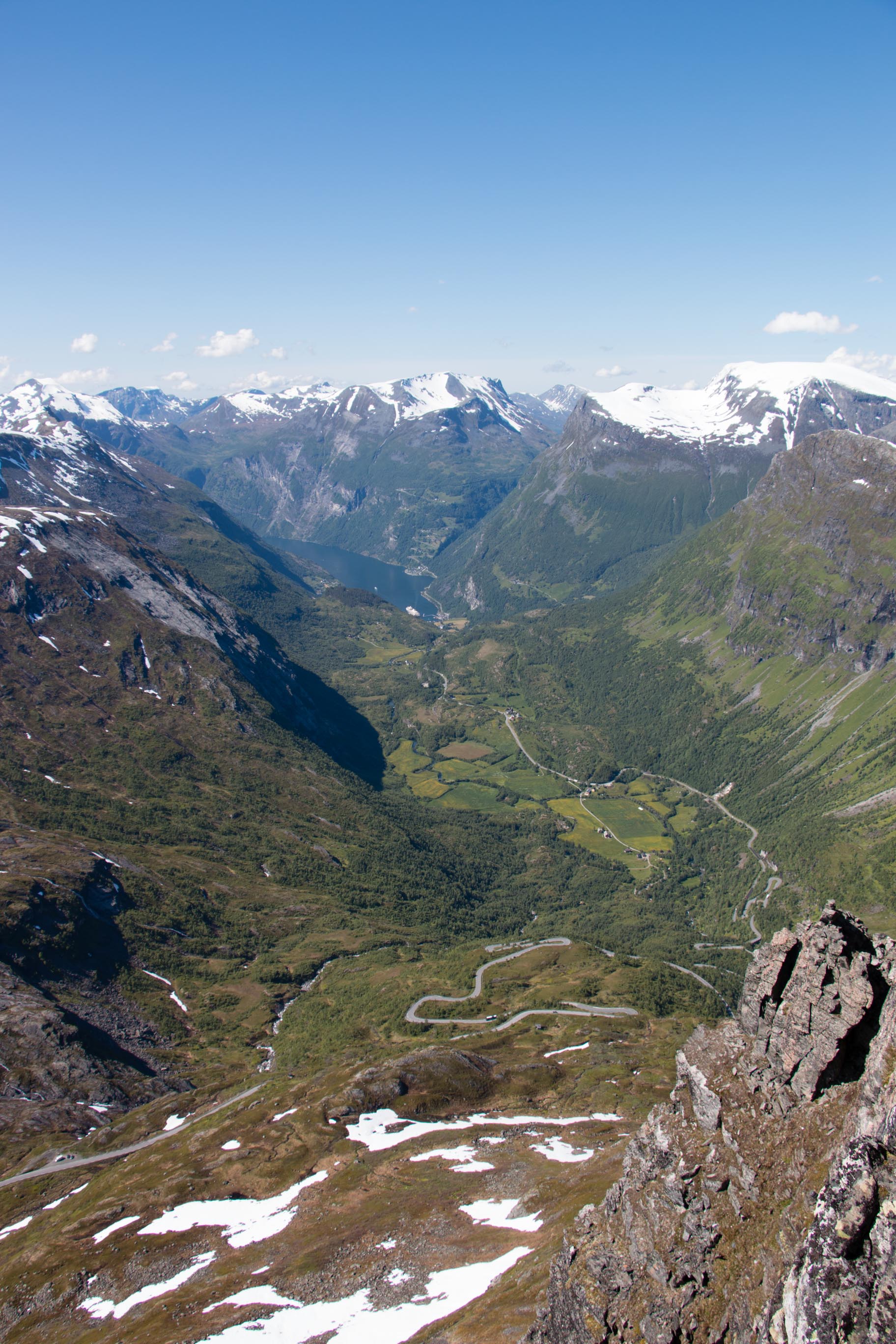 Het is op dit moment heerlijk weer in Noorwegen en wij genieten daar volop van. We rijden vandaag weer door prachtige natuur naar onze volgende bestemming, Geiranger. Via een bergpas die nog op enkele plekjes sneeuw heeft liggen voor ons genieten we weer van een prachtige rit. Vanaf het uitzichtpunt kijken we uit op Geiranger, niet wetende dat ons hutje precies onder dit uitzichtpunt ligt.