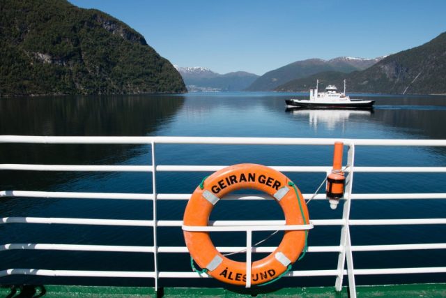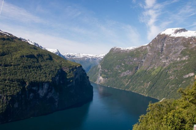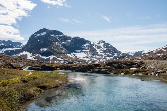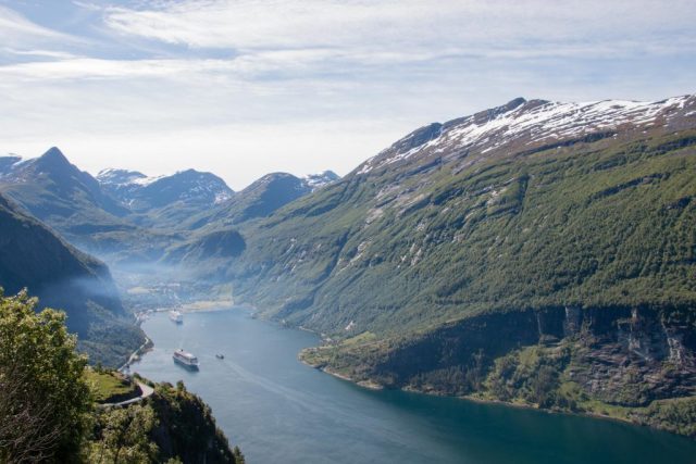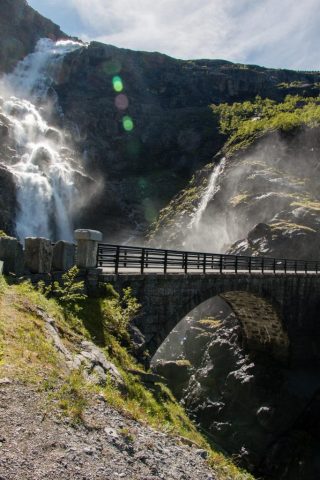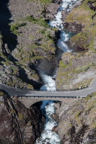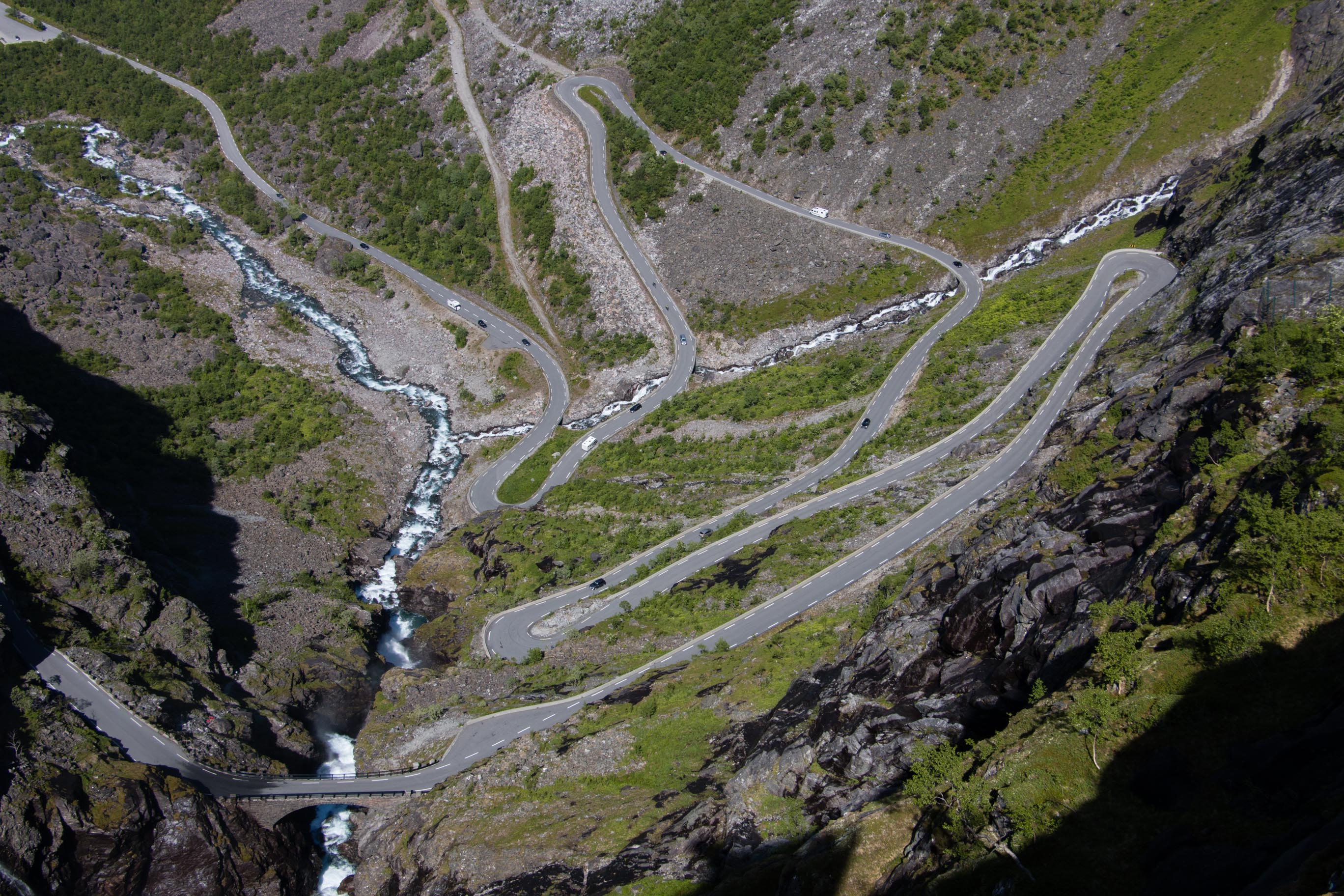 Voordat we vandaag naar ons hotel in Alesund gaan, rijden we eerst een route die bekend staat als ‘de gouden route’ van Noorwegen. Het is een route die je door een hele mooie omgeving leidt met prachtige blauwe meren, stromende smalle beekjes en prachtige bergen waar je op de toppen de sneeuw weer ziet liggen. Aan het eind van deze gouden route is de Trollstigen. Een weg met 11 haarspeld waar je de auto’s, bussen en motoren soms met moeite omhoog en naar beneden ziet gaan. Sommige hebben aan het eind geen remblokken meer over en een motorrijder heeft de pech niet omhoog te komen. Gelukkig heb ik mijn Formule 1 coureur weer naast mij zitten en komen wij veilig en wel beneden.